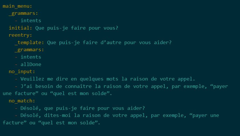 - La grammaire des intentions (intents grammar, spécifiée à l’aide la clé spéciale _grammars) est définie une fois au premier niveau du menu principal et s’applique à chaque réponse (à moins qu’on lui en substitue une autre) pour éviter la répétition.