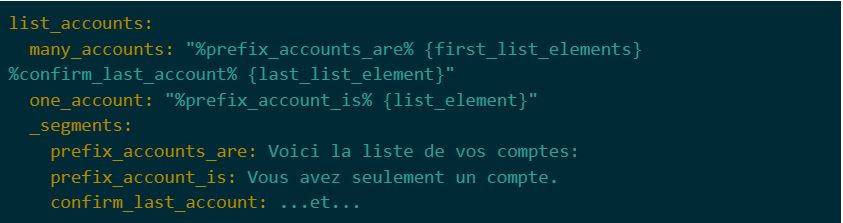 Les divers éléments de réponse de nos applications sont définis dans un fichier structuré de format YAML qui relie l’état du dialogue, les ressources associées ainsi que le contenu dynamique.