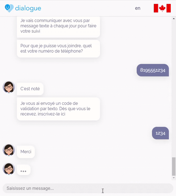 Le design du flux d’inscription au suivi quotidien a été approfondi pour y inclure certains cas d’exceptions. Cela était nécessaire puisque le numéro de téléphone et le code de validation étaient recueillis auprès de l’utilisatrice directement sous forme de texte. Voici les cas plus problématiques que nous avons traités: