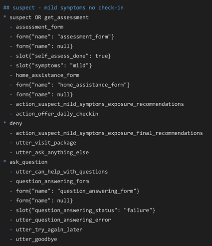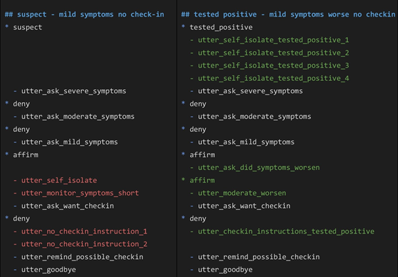 Dans cette première partie, j’ai décrit comment nous avons utilisé les histoires et les formulaires pour implémenter les multiples variantes des flux de dialogue d’auto-évaluation et de suivi quotidien. Quoique les histoires étaient adéquates au départ pour définir des arbres de décision simples contenant peu de branches, il est rapidement devenu évident qu’elles ne constituaient pas le meilleur outil pour implémenter des arbres de décision complexes, des branchements conditionnels ou encore des portions de flux réutilisables. Nous avons donc dû créer plusieurs formulaires qui ont été enchâssés dans des histoires, et recourir aux histoires pour gérer les flux à plus haut niveau.