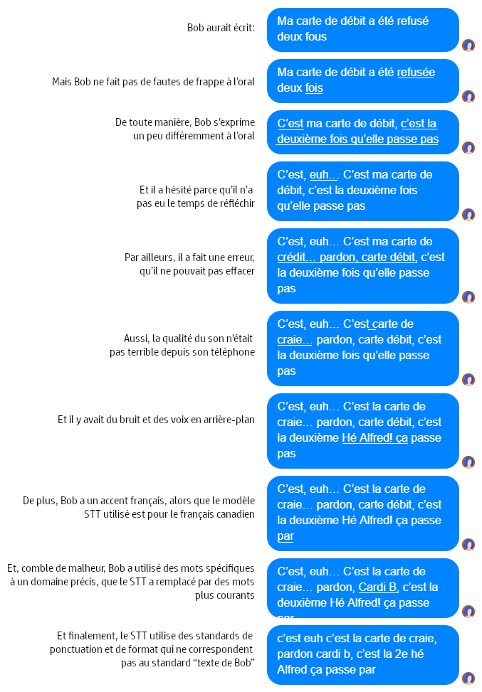 Bien entendu, Bob et sa malchance légendaire n’existent pas, mais les cas présentés sont tirés de la réalité. Même si certains modèles de STT peuvent maintenant ignorer les “euh”, les bruits et les voix secondaires, la transcription comportera toujours son lot d’erreurs.