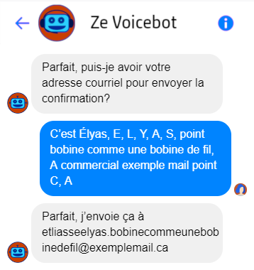 Les adresses, les courriels ou les noms de personnes sont des informations difficiles à transcrire correctement pour de multiples raisons, mais peu problématiques à l’écrit. Si certaines sont critiques pour un cas d’utilisation, il pourrait être très complexe, risqué, ou inadéquat pour l’expérience utilisateur de l’implémenter vocalement.