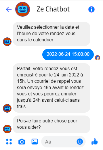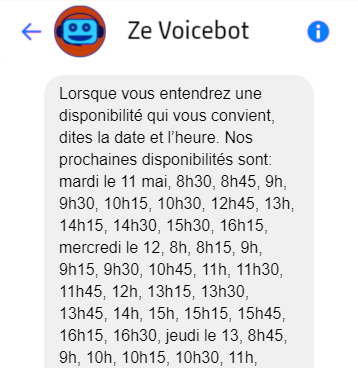 Dans d’autres cas, plusieurs interactions vocales pourraient être nécessaires pour obtenir le même résultat qu’un seul extrant visuel complexe. Voici, par exemple, ma meilleure tentative de reproduction extrant pour extrant d’un bot de prise de rendez-vous:
