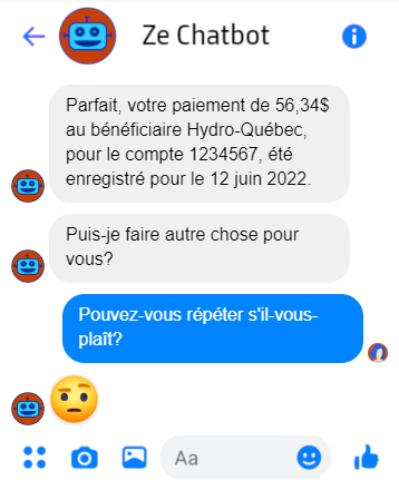 Que fait un chatbot si l’utilisateur est inattentif, a mauvaise mémoire, ou a oublié de mettre ses lunettes? Rien! L’extrant reste là pour que l’utilisateur le relise comme bon lui semble, ce qui rend certains cas nécessaires à l’oral très inutiles à supporter à l’écrit: