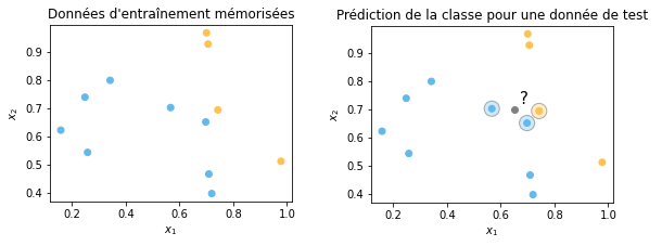 Exemple pour un KNN avec k=3 et distance euclidienne. Pour l’exemple de test en gris, on
